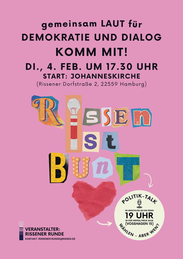Der Demo-Zug endet am Rissener Schulcampus – aus gutem Grund: Hier beginnt um 19 Uhr in der neuen Aula ein Polit-Talk. Vertreterinnen und Vertreter von sechs Parteien haben ihre Teilnahme an der Veranstaltung zugesagt, zu der der Bürgerverein Rissen einlädt. „Probleme wie Kriege in Europa und Nahost, die wirtschaftliche und politische Lage in Deutschland oder der Klimawandel verdichten sich bei vielen zum Eindruck einer politischen Krise. In unserem Polit-Talk ‚Was ist Demokratie?‘ diskutieren wir mit Bürgerschafts-Kandidatinnen und -Kandidaten, ob die parlamentarische Demokratie, wie wir sie in Deutschland leben, die richtige Grundlage für die Lösung drängender Fragen bietet,“ so umreißt der Bürgervereins-Vorsitzende Claus Scheide die Veranstaltung. Und in seiner Rolle als Sprecher des Stadtteilbeirats Rissen ergänzt er: „Offener Austausch und echter Dialog sind auf allen Ebenen notwendig, vom persönlichen Umfeld bis zur Bundesebene oder sozialen Medien. Das ist ein zentrales Thema dieser Zeit. Und ich bin mir sicher, dass das viele Rissenerinnen und Rissener bei unseren Veranstaltungen am 4. Februar unterstreichen werden!“